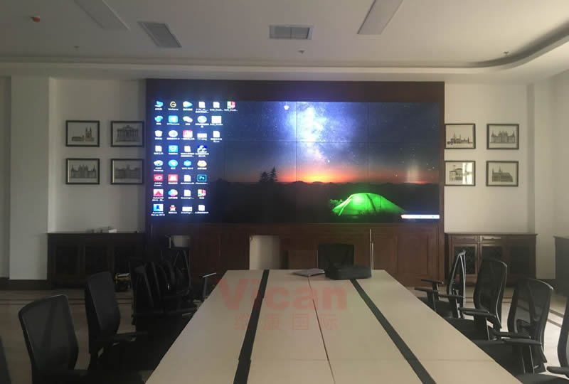 湖南某旅游局的这套会议大屏由维康国际提供,采用3x4拼接、55寸1.7mm液晶拼接屏,在中式办公空间里散发内敛气质。