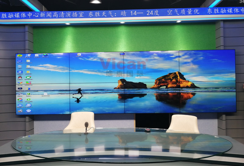 我公司为东胜融媒体中心新闻高清演播室提供这套大屏,采用2x3、55寸拼接屏,0.88mm超窄边拼缝设计。