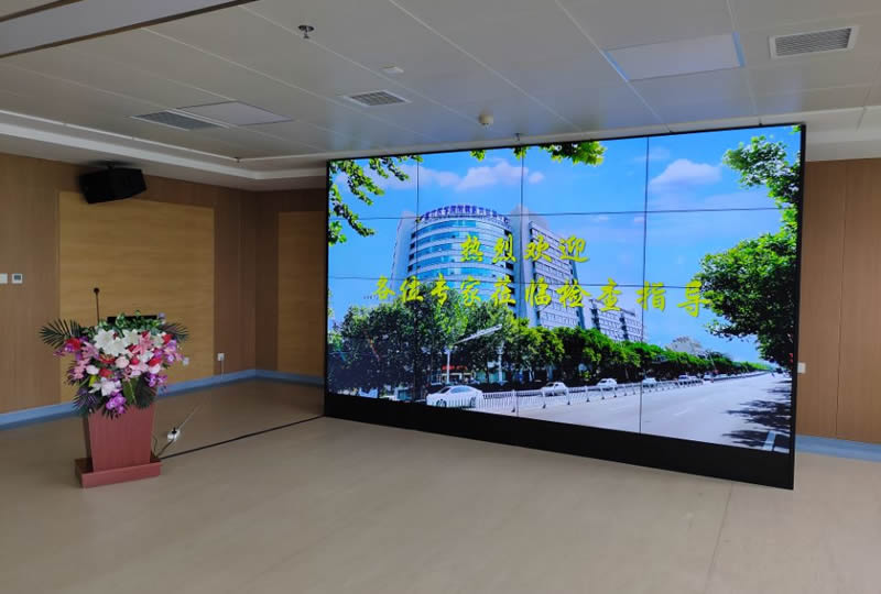 潍坊医学院眼科中心这套大屏采用4x4拼接、55寸3.5mm液晶拼接屏,用于会议信息显示。