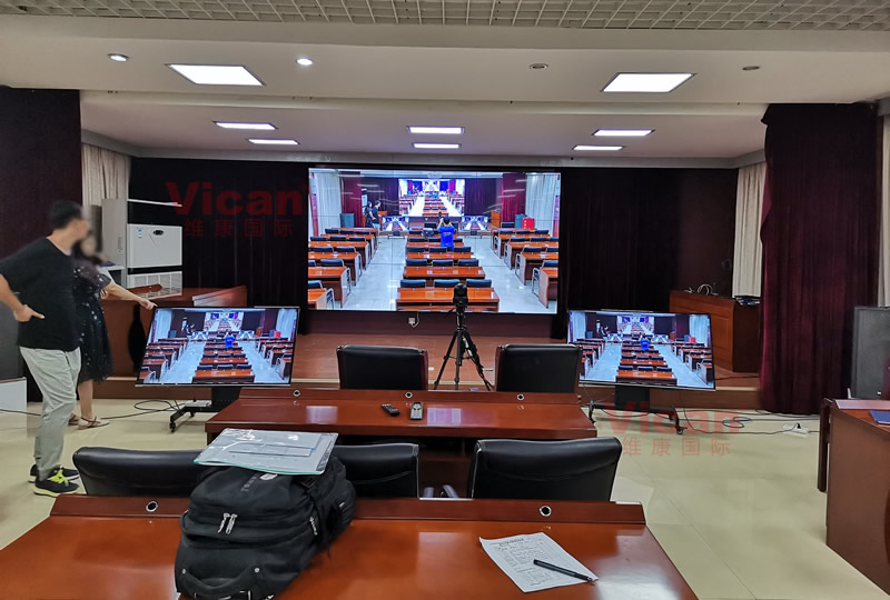 这套会议大屏由3行3列、55寸液晶拼接屏组成,超窄边设计,有着很好的一体化显示效果,主要用来视频会议、会议信息显示使用。