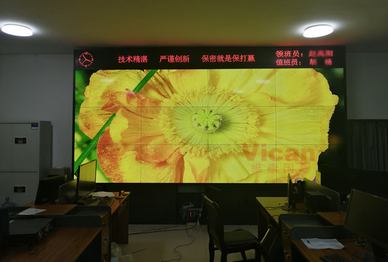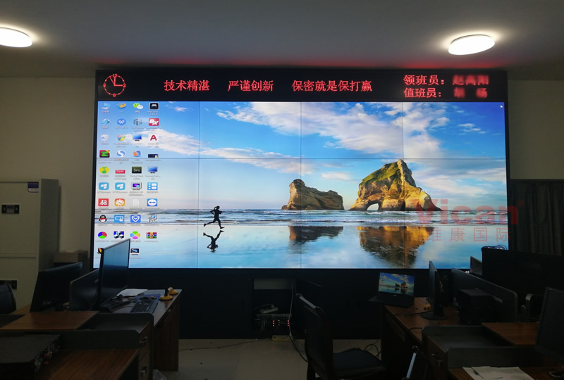 维康国际为河南某部队提供的这套会议大屏,采用3行4列、55寸液晶拼接屏,产品性能稳定,超窄边设计,双边拼缝仅有0.88mm,如上图所示,有着很好的画面一体化显示效果。