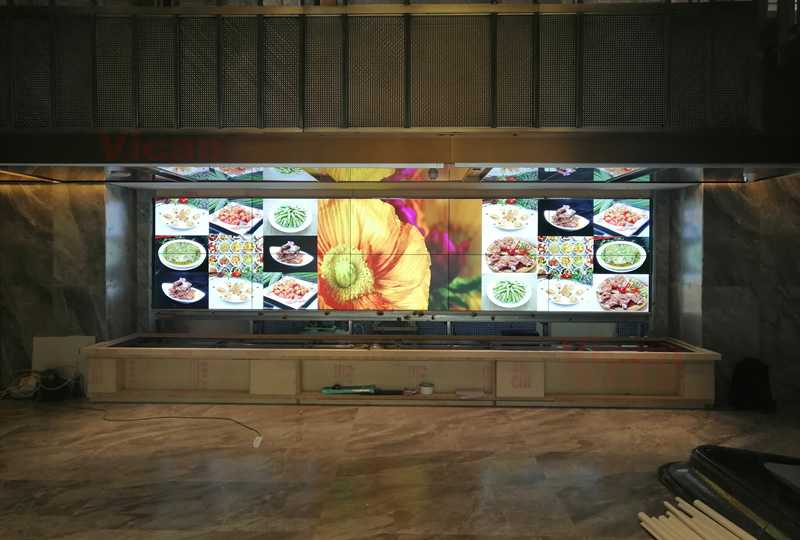 惠州海鲜酒店采用这套显示大屏,采用2x5拼接、55寸液晶拼接屏,3.5mm拼缝,主要用来显示美食特色与信息公告。