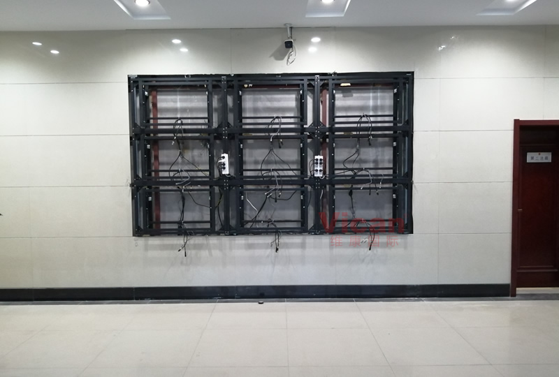 维康国际为永和县人民法院提供的这套高清显示大屏,由3行3列49寸拼接屏组成,双边拼缝为3.5mm,采用内内嵌式安装,与前面成一体,更显美观大气,前维护支架,后期如若需要维护更简单便捷。