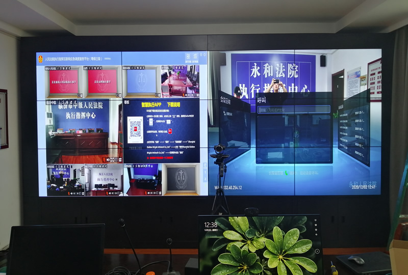 本案例中,维康国际为永和人们法院提高一套视频会议显示屏,主要由3行4列、55寸3.5mm液晶拼接屏组成,主要用来视频会议显示使用,大屏画面高清显示,产品性能稳定。
