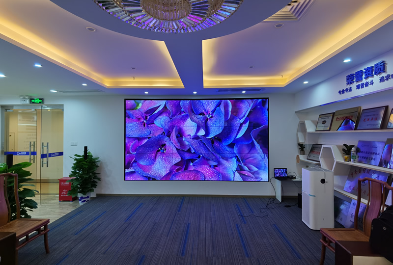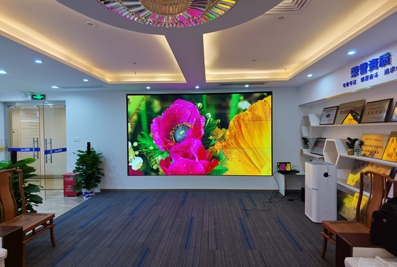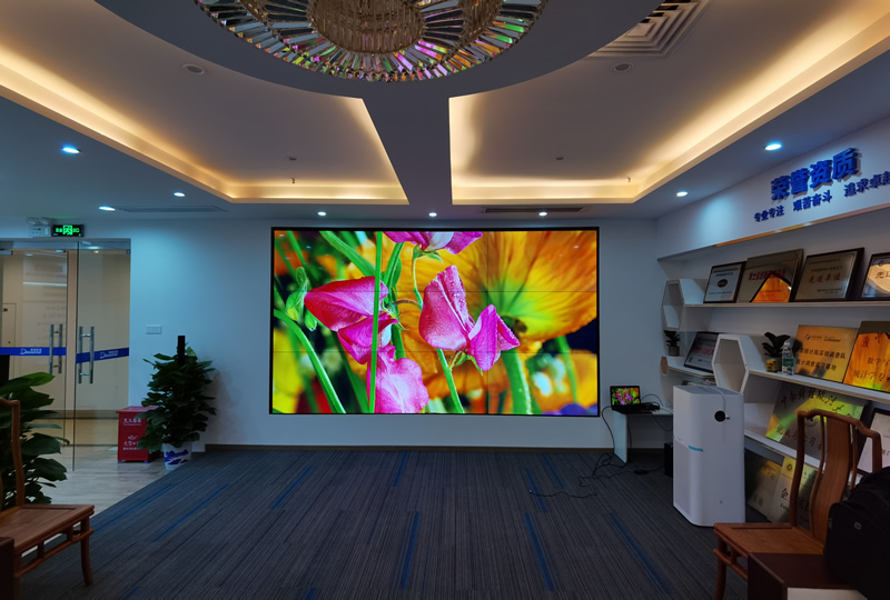 本案例中,维康国际为深圳罗湖某科技公司的展厅提供一套显示大屏,采用3行3列拼接、55寸LG液晶拼接屏,超窄边设计,大屏显示清晰亮丽,物理拼缝仅有0.88mm,有着很好的画面一体化显示效果。