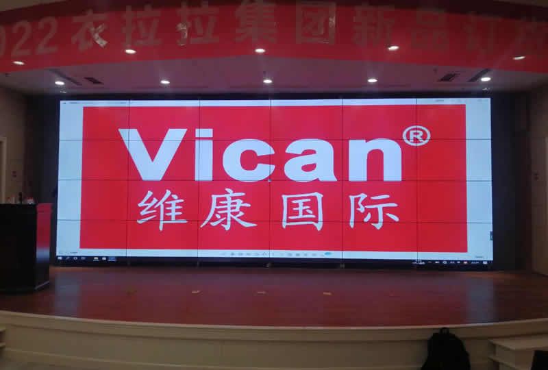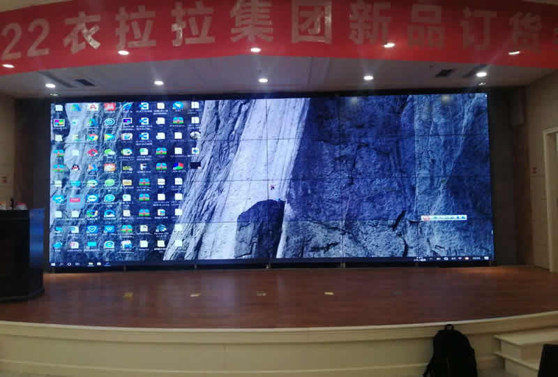 本案例中,维康国际为山东衣拉拉集团提供一套会议厅大厅,由4x6拼接、55寸液晶拼接屏组成,双边拼缝为3.5mm,大屏幕清晰、超大尺寸,如上图所示。