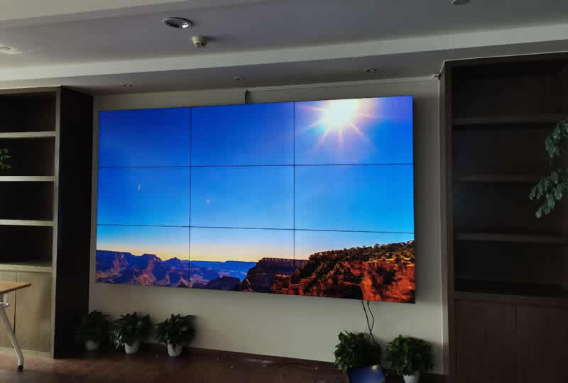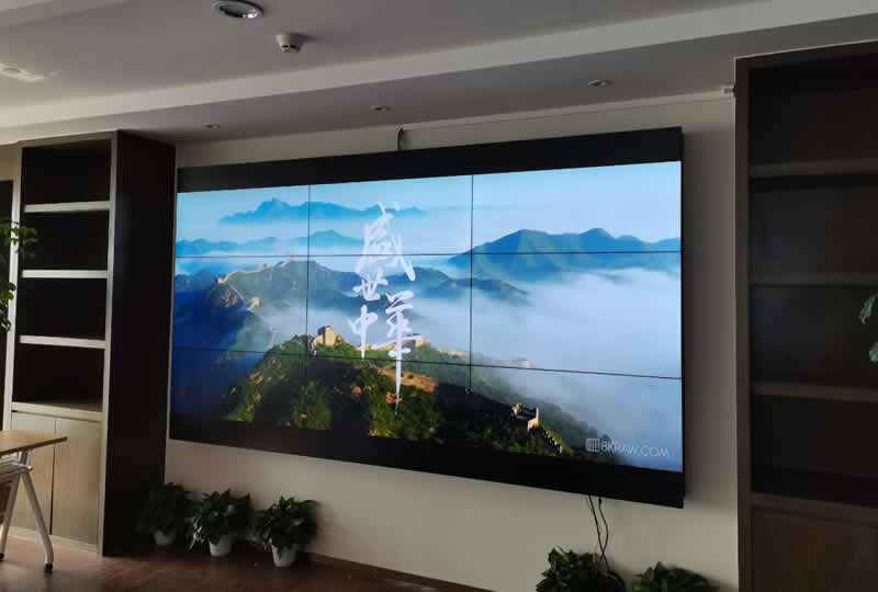 这套会议室显示屏采用的是3行3列、55寸拼接屏,京东方3.5mm液晶面板,色彩丰富、白平衡效果好,壁挂式安装,更美观、简洁。