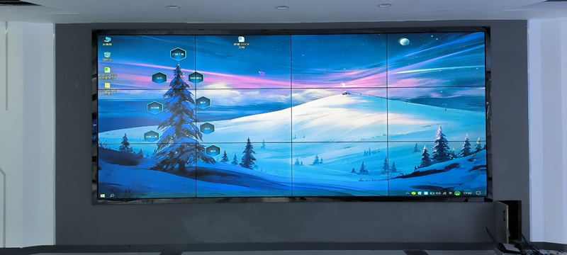 本案例中,维康国际为中建八局安图县某项目部提高一套会议室显示大屏,采用3*4拼接、3.5mm拼缝的55寸拼接屏,壁挂式安装,更显美观大气。