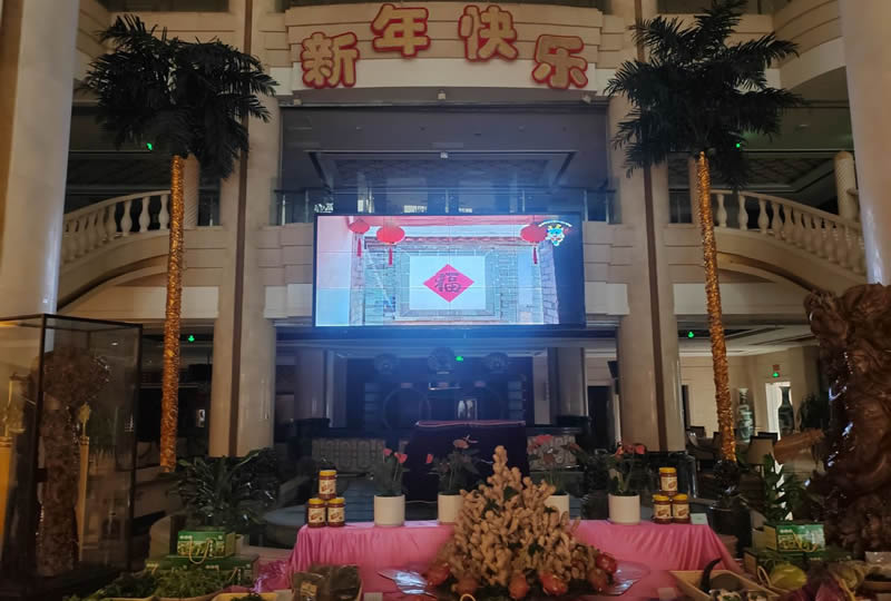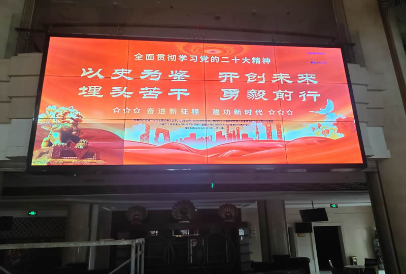 本案例中,维康国际为龙口市海湾大酒店提供一套高清显示大屏,由3行4列、55寸液晶拼接屏组成,如上图所示,大屏幕显示清晰亮丽,一体化显示效果好。
