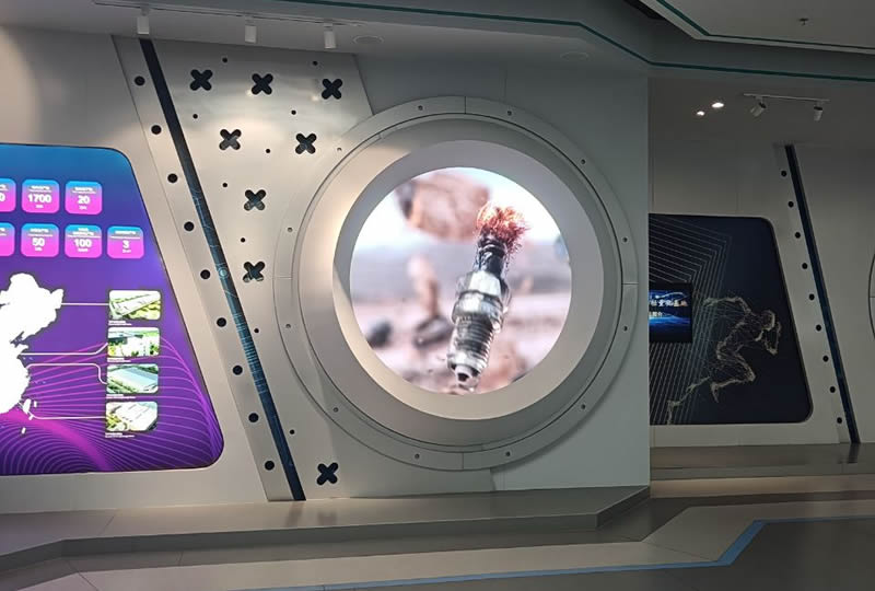 本案例中,维康国际为山东魏桥创业集团的展厅提供了多套多形状的LED显示屏,如上图所示,由梯形、圆形、长方形拼接组成,大屏幕显示清晰,视觉体验效果好。