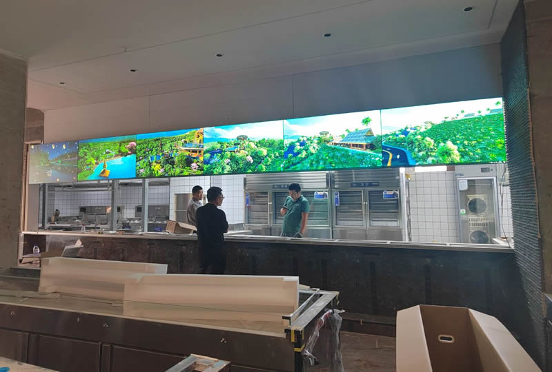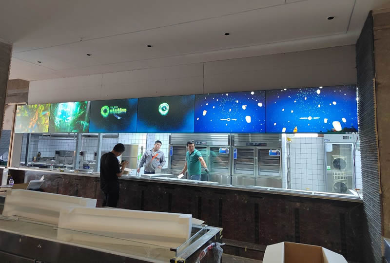 深圳市某企业食堂橱窗提供一套显示大屏,采用1*6拼接、55寸液晶拼接屏组成,如上图所示,屏幕显示清晰,视觉效果好。