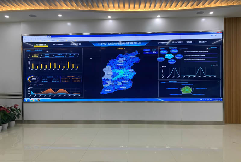 该案例,是维康国际为国家电网-太原河西营业厅安装了一套大数据显示屏系统,这套系统主要由3x5/55寸0.88mm液晶拼接屏组成。我们可以从上图看到,大屏画面清晰亮丽,超小缝隙拼接,有着很好的视觉体验效果。