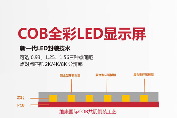 本产品采用 COB封装技术,和传统的 SMD 表贴式封装不同,它是将发光芯片集成在 PCB 板中,而非一颗颗焊接于 PCB。该技术有效提升了 LED显示屏可靠性、发光光色,防护性能等。