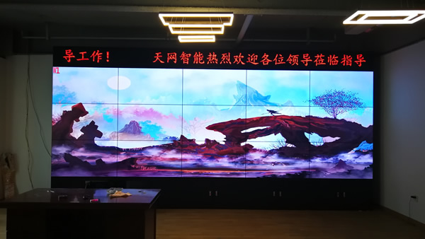 这套大屏安装在湖南省天网智能科技有限公司的展厅,采用3x5拼接、55寸液晶拼接屏,双边拼缝为3.5mm,主要用来大数据显示使用。