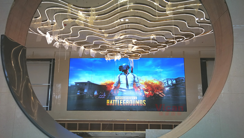 我公司为云南昆明某售楼中心提供的这套显示大屏,采用4行5列、55寸拼接屏,双边拼缝仅有3.5mm,大屏幕画面显示清晰、亮丽,有着很好的一体化显示效果,如上图所示。