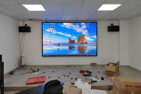 COB小间距LED显示屏采用压铸铝箱体式设计,箱体比例16:9,支持前维护安装。