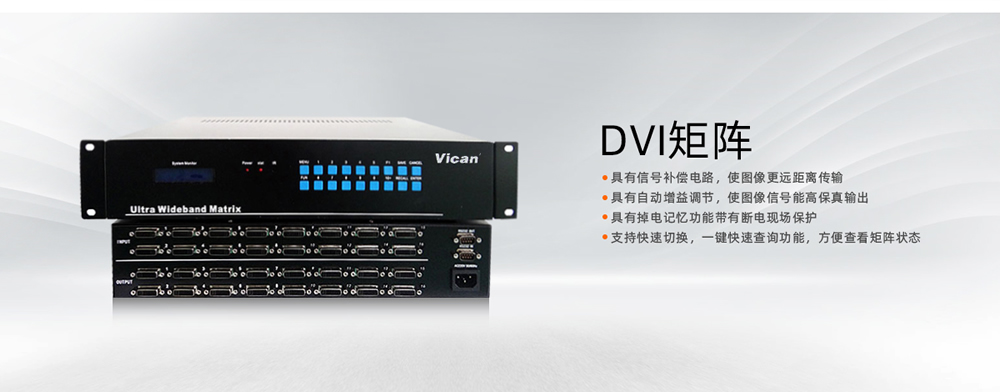 DVI矩阵JZ1000系列是专用于DVI高清2K信号输入与输出的控制设备,其特点与HDMI信号相同,都是高清信号控制系统,包含4进4出、4进8出、4进16出、8进8出、8进16出等;