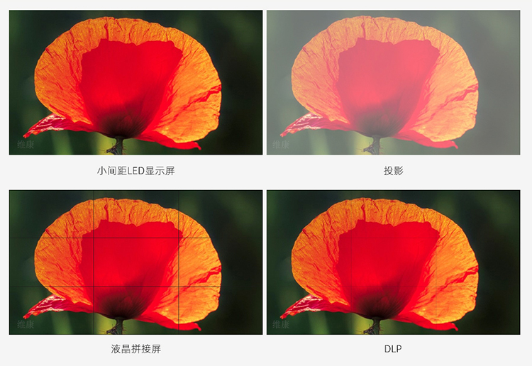 以下为小间距led显示屏、投影、液晶拼接屏、DLP四种主流的大屏显示技术的效果对比,通过对比可以看到投影由于对比度低导致屏幕发白,而液晶拼接屏与DLP都有不同程度的拼缝,P1.2小间距led显示屏由于点间距只有1.2毫米,所以即没有拼缝而且分辨率也有保证。