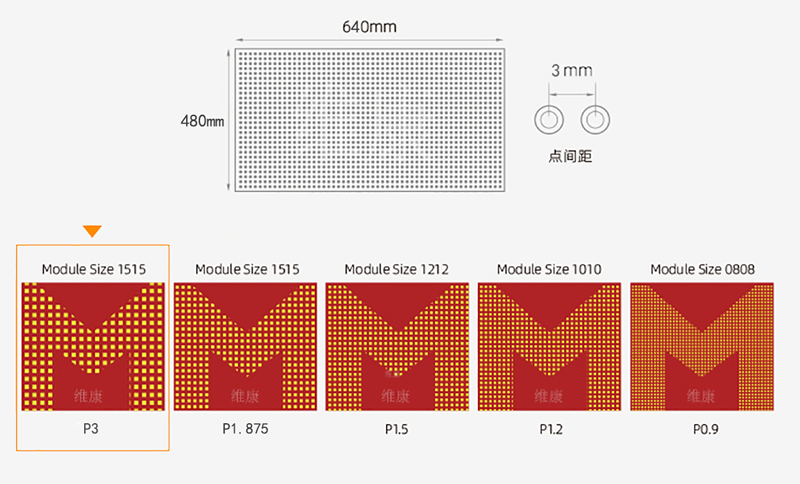 采用行业压铸铝箱体,设计精度高,平整度高。箱体尺寸为640×480/(mm),模组尺寸宽320×高160mm,箱体重量7kg,亮度600~800cd/m2可调,像素点间距3mm。