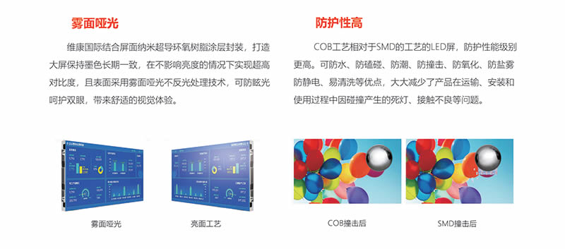 COB集成封装显示屏采用面板封装技术,没有灯脚裸露问题,具有防潮、防尘、防静电等功能。