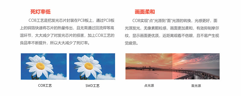 COB集成封装产品把芯片封装在PCB板上,直接通过整个PCB板的面积进行散热,热量容易散发,延长了显示屏寿命。