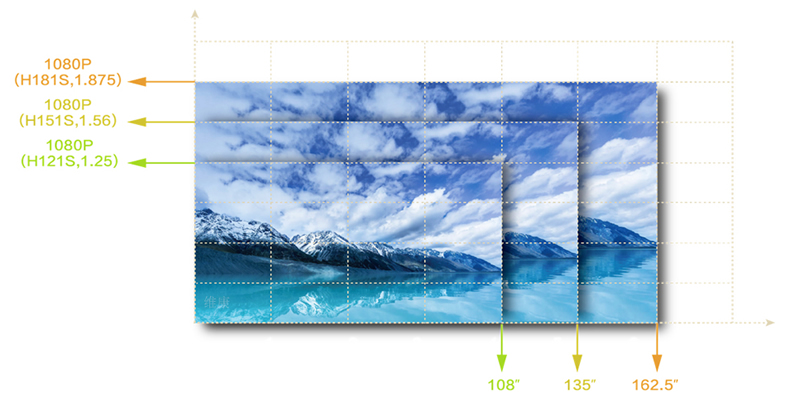 由于箱体是16:9比例,所以在拼接时只要保证等比例数量的拼接,整个LED显示屏就不会发生变形,从而保证整体的显示效果。如下图,P1.53小间距LED显示通过5*5拼接后即可达到一个1080P的分辨率效果。