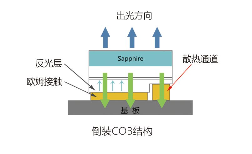 COB倒装片技术即倒装芯片的电极是朝下的,而且不需要正装芯片的引线缝合焊接工艺,这样有源层更贴近基板,缩短了热源到基板的热流路径,具有较低的热阻,可以大大提高产品稳定性。