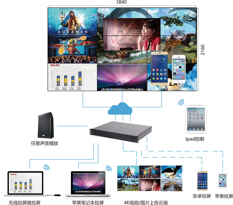 无需任何输入,4K“融媒体”处理器拼接播放可达4K分辨率(3840*2160)。使用处理器及矩阵,需要4K输入信号源并且配备双链路输入接口;成本高昂且操作性差。